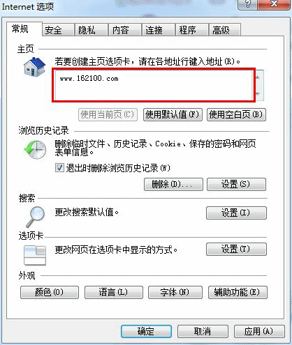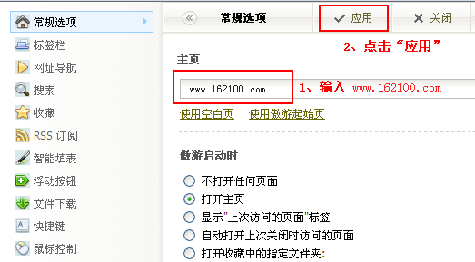 2)然后在打开的对话窗口中的主页栏的地址输入框中输入“http://zk.58q8.com/”,然后点击窗口上方的“应用”按扭即可,如下图所示: