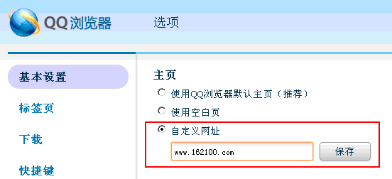 2)然后在打开的对话窗口中选择“自定义网址”并输入“http://zk.58q8.com/”,然后点击“保存”按扭即可,如图所示: